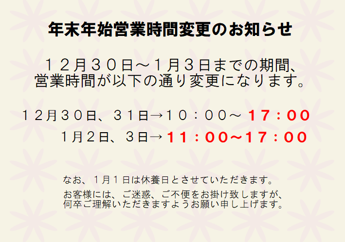お知らせ お知らせ 新商品 イベント メディア掲載 お知らせ 新商品 イベント メディア掲載 2025.12.13 年末年始営業時間変更のお知らせ 2025.12.13 2026年1月の定休日のお知らせ 2025.11.13 クリスマスケーキの予約始まりました 2025.11.08 12月の定休日のお知らせ 2025.11.02 オーダーメイドデコレーションケーキについてのお知らせ 2025.10.29 本日より3日間、ハロウィン限定ロール販売中! 2025.10.16 11月の定休日のお知らせ 2025.09.20 かぼちゃスイーツ/ハロウィンギフト販売中! 2025.09.11 季節限定!大和コメコメドーナツ! 1 2 3